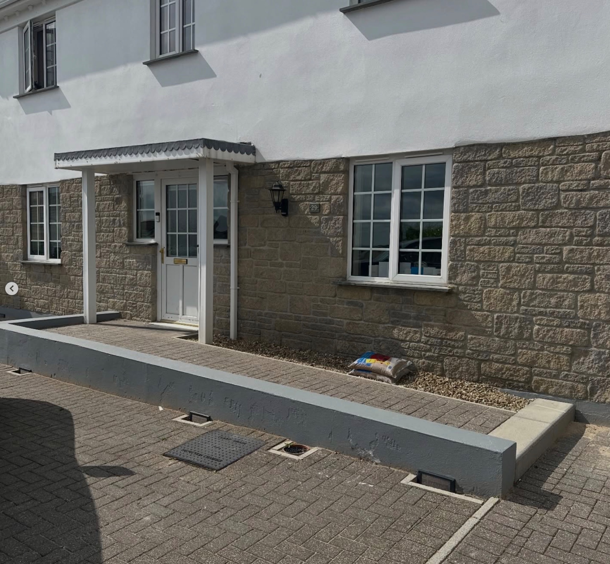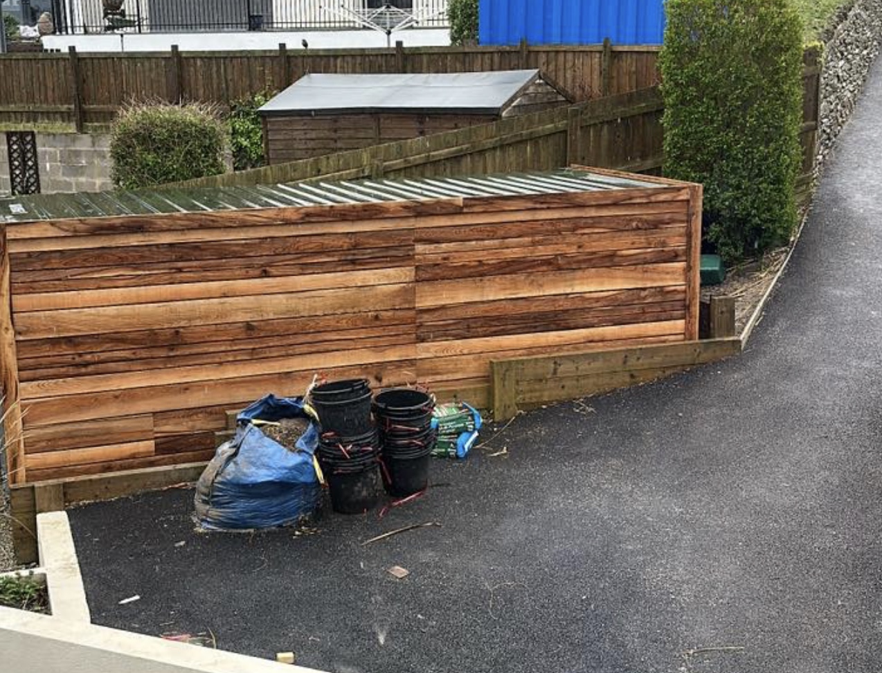 The removal of a raised garden to add space for additional parking including a set of steps and a stone wall.